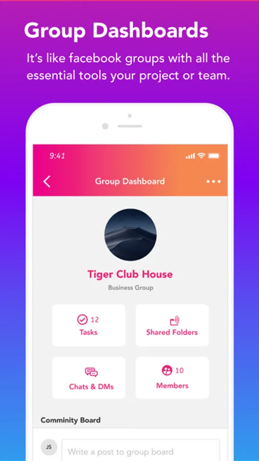 Groups. Create a group for each team or community of folks that you want to coordinate and collaborate with, such as clients or friends and other workers or freelancers. A great example is a team that you want to work with on a given task or project. Once the group is created, members post and share information with one another on the Group Community Board. Each Group Community Board is only visible to members of that group.