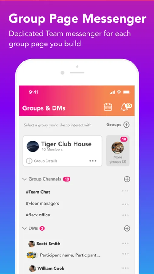 Chats. The Chats section of the app provides you to message with the group chat available to each group, or by Direct Message with other individuals, groups of individuals that you define. Message delivery is very fast and responsive. You can message text, photos, videos and any type of file or web link. Tasks create a special part of Messenger by opening a Task Chat for each task with each member of the Task.