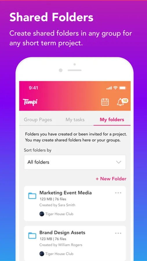 Shared Folders. Our Shared Folders feature creates Folders for your storage and sharing of files. In your group, go to Shared Files where all files posted on the Group Board or Shared in Group Chat / Group Direct messaging are stored for easy group member access. The third area is called Shared Folders where you create a Folder and use it for personal storage or invite anyone (a group member or someone outside of the group or even outside of Tempi via email to give them access to that folder) - to transfer files to them and back and forth.
