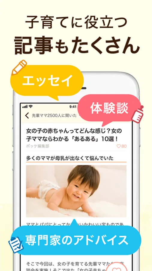 ママの産後ケアや授乳、寝かしつけ、ベビーサイン、赤ちゃんのお世話に関することなど、育児の専門家による記事も読める!