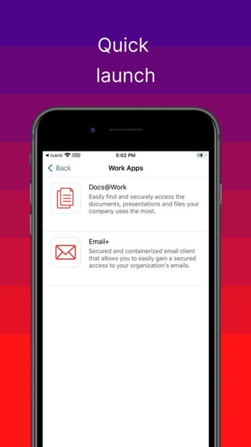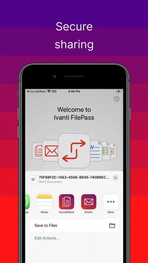 Ivanti FilePass allows users to launch Docs@Work and Email+ directly to be able to share documents. FilePass also allows you to securely share files with Microsoft Intune managed Office Applications like Microsoft Word, Microsoft Powerpoint, Microsoft Excel from Ivanti Docs@Work and Ivanti Email+. These files can be viewed, edited and saved in the Intune managed mobile apps and shared back to Ivanti Email+ and Docs@Work.