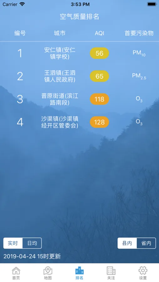—排名:查看实时和日均的关注城市,站点,省内城市空气质量
