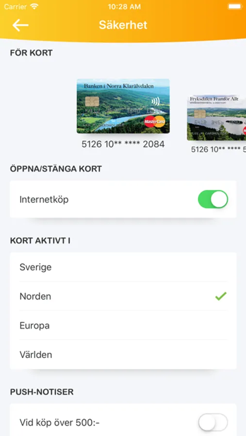 * Av/På – Möjlighet att stänga av /på kortet för köp i olika regioner utanför Sverige