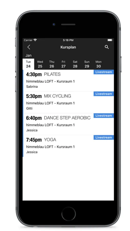 Direkter und aktueller Zugriff auf den Kursplan von überall: Für jeden Kurs kannst Du Details wie Zeit, Kursbeschreibung, Raum und Merkmale wie z.B. den Schwierigkeitsgrad einsehen.