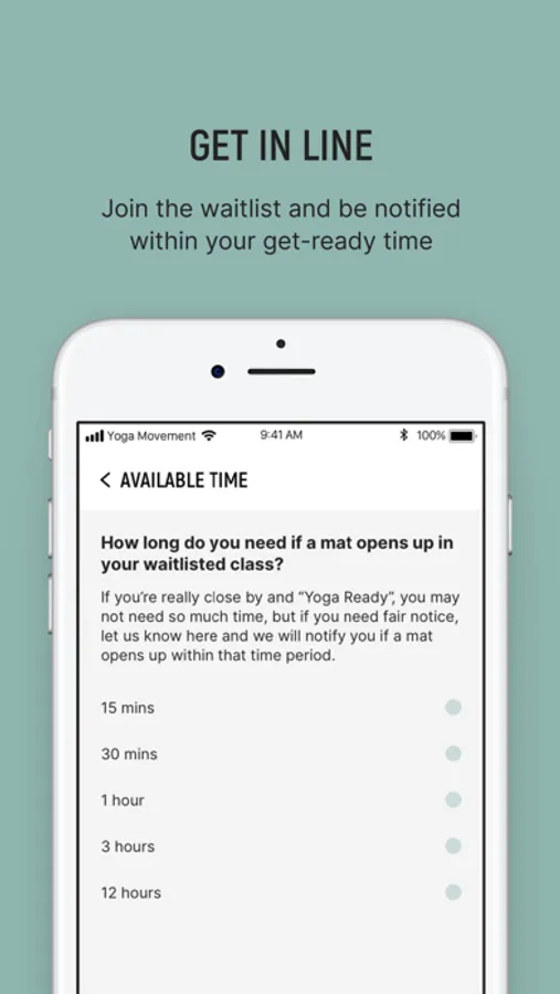 Set a time needed to get ready for class. As soon as a mat frees up for you, you’ll receive a ping to tell you that you’ve automatically been added to the class!