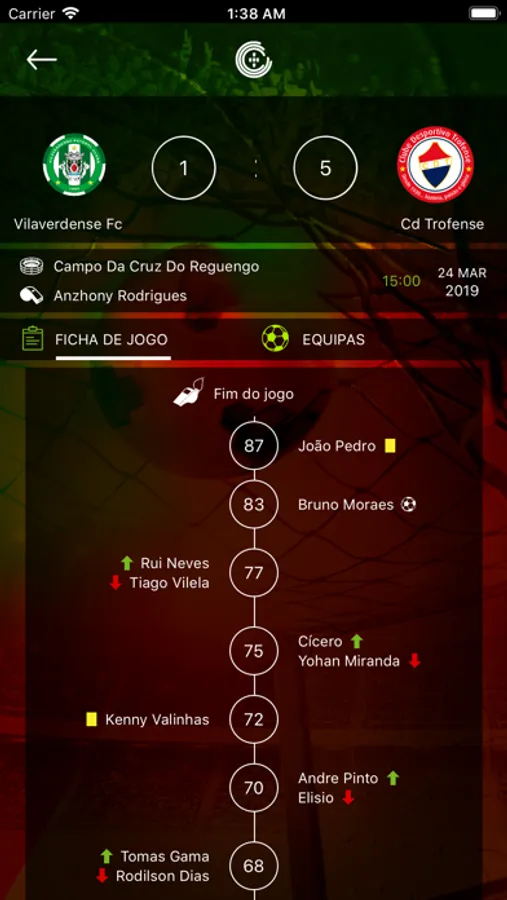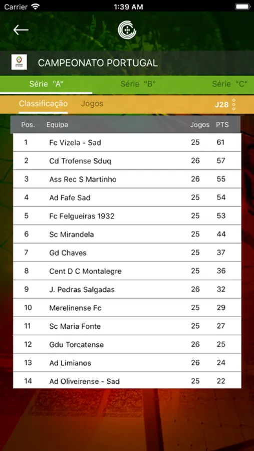 Classificações e detalhes dos jogos: Confere a classificação das competições e os detalhes dos jogos. Local e data do jogo, alinhamento das equipas, substituições, golos e sanções disciplinares.