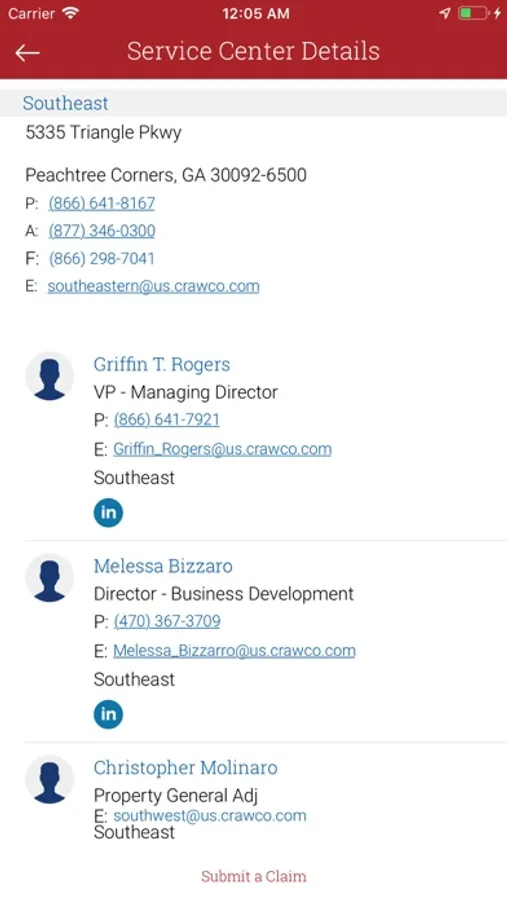 The Crawford Directory app is a one stop information portal to provide details on Crawford services, locations and people. Customers can easily determine the nearest Crawford location, view associated contact details, management, sales, product and adjuster teams and even submit assignments directly to Crawford from the app.
