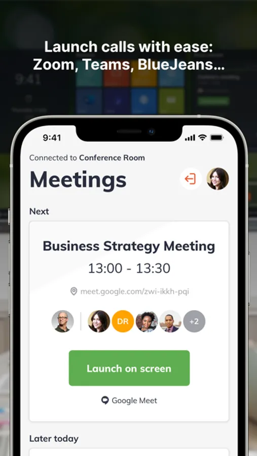Launcher mobile app is a one-touch call launcher for meeting room displays that allows you to start or join calls, no matter which video conferencing tool you use: Microsoft Teams, Zoom, BlueJeans, Webex, GoToMeeting, Lifesize, Skype for Business, and more.