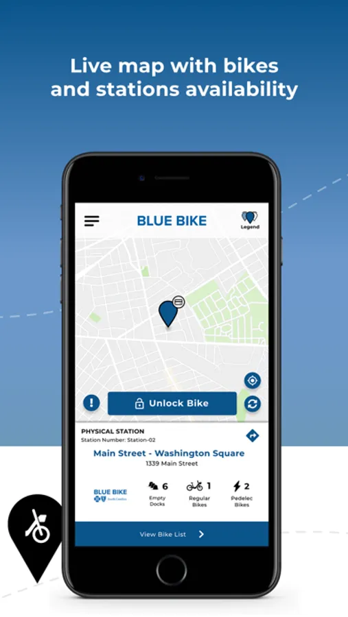The official BlueBikeSC App is your ultimate tool to bike around the City of Columbia. Use the App to check bike availability at each station as well as your profile and previous routes. You can even unlock a bike!