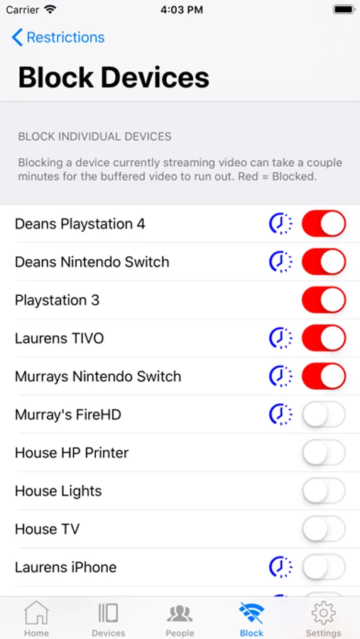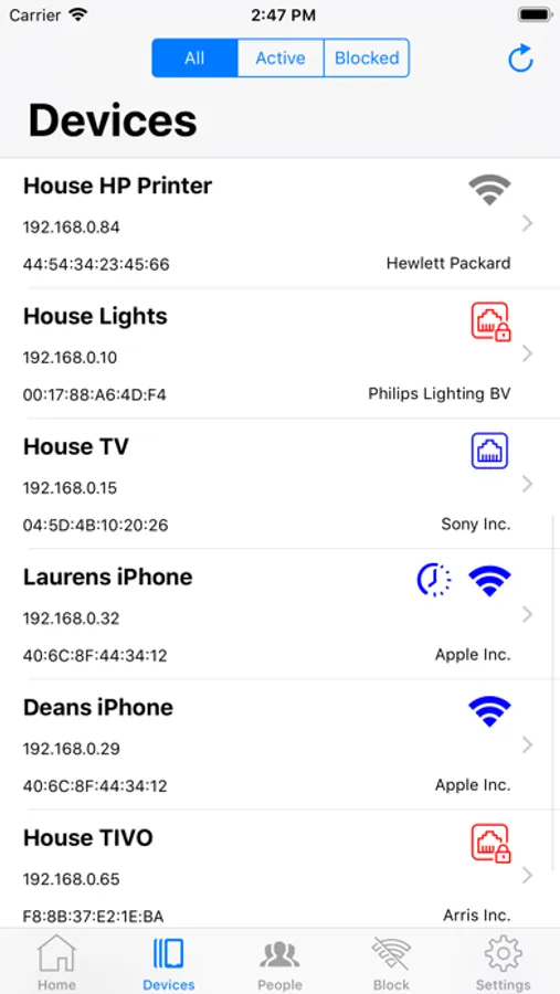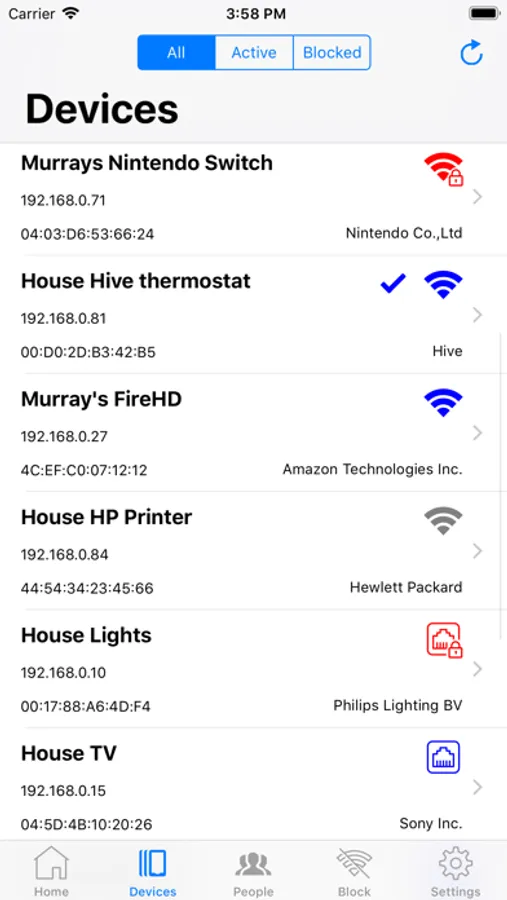 • Filter between All, Active or Blocked devices. Use the Active filter to know at bedtime which devices are still powered on and need powered off, saving electricity and good to get into good habits of chasing the family to power off their devices at night