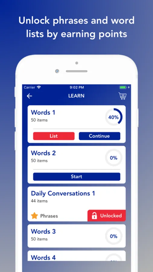 - Earn points by learning and practicing. Then unlock phrases and word lists.