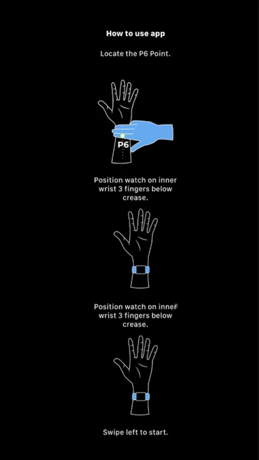 Sense Relief App™ uses acupressure to quickly and effectively relieve your nausea and vomiting associated with morning sickness and motion sickness. The acupressure is delivered through the Apple Watch’s Taptic Engine and Sense Relief’s nerve stimulation technology. The App applies pulsating acupressure on the underside of the user’s inner wrist, to stimulate the P6, or Nei-Kuan, nerve acupoint.