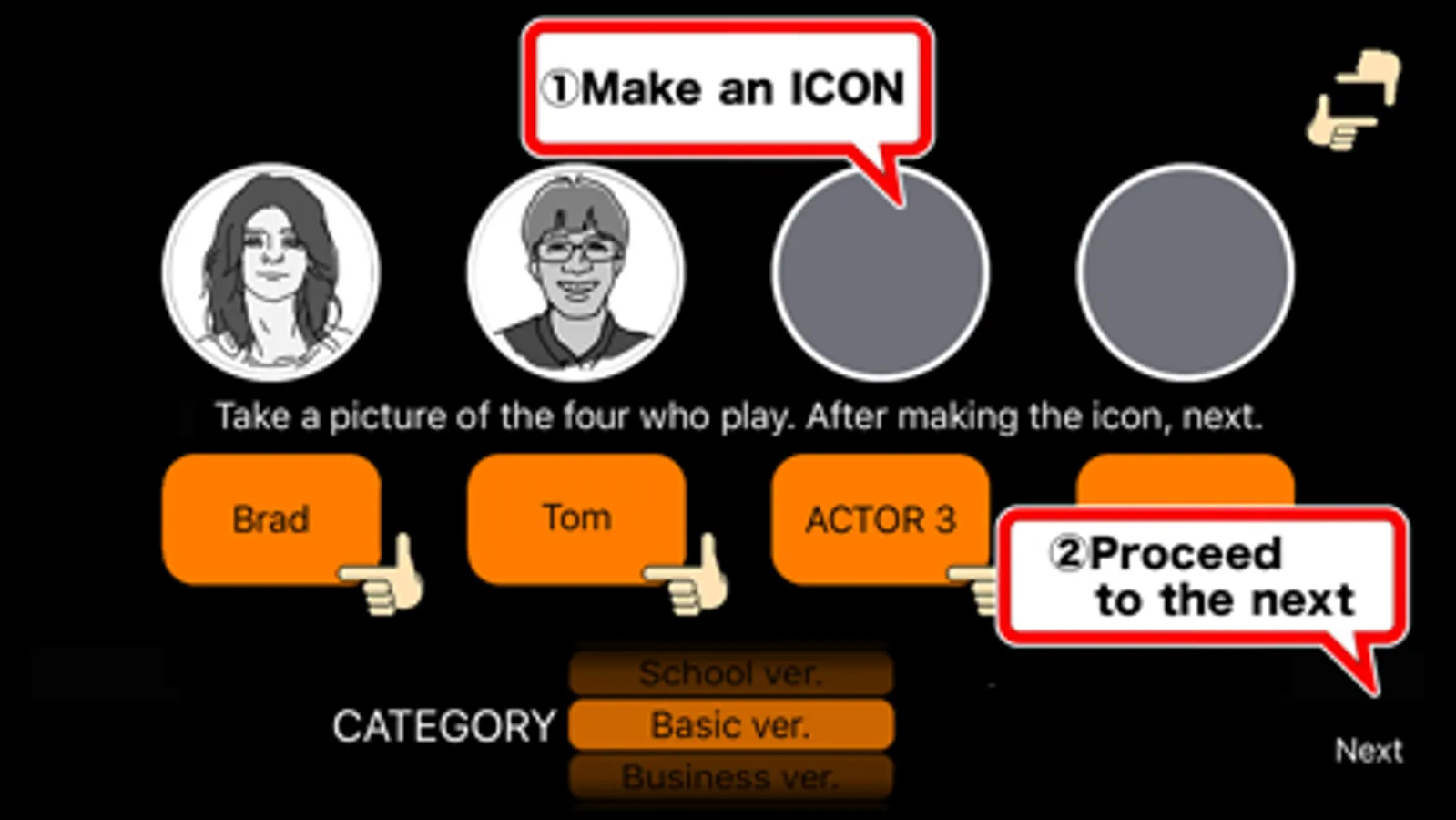 Scroll and select a match from [2 players] [3 players] [4 players]. Tap [ACTOR], select this member, select a category and tap [Next].