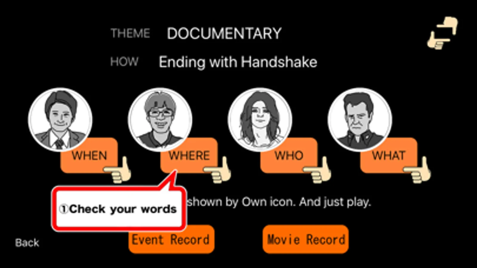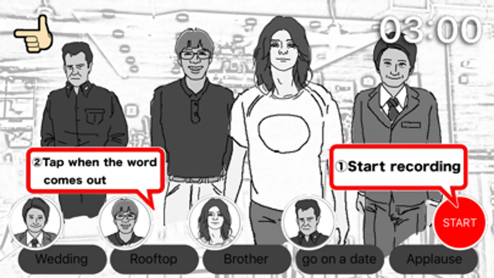 If the other player answers [CHARA] correctly, the photographer should [double-tap] each button to let them know. Press and hold to zoom in on the word the player is approaching and let the audience know.