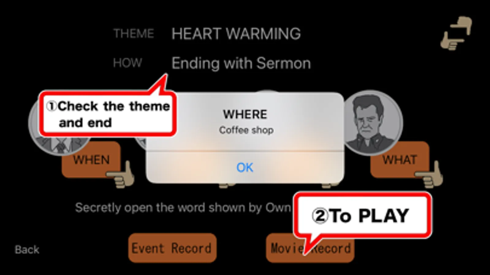 Play time is 3 minutes. Each player checks the words [WHEN] [WHERE] [WHO] [WHAT] and proceeds to talk to other players instead of using them. Understand the other person's word from conversations and actions, and create a drama of [when] [where] [with whom] [what you did] while applying the word. End the drama with the action described in [HOW] that can be used 30 seconds before the end.