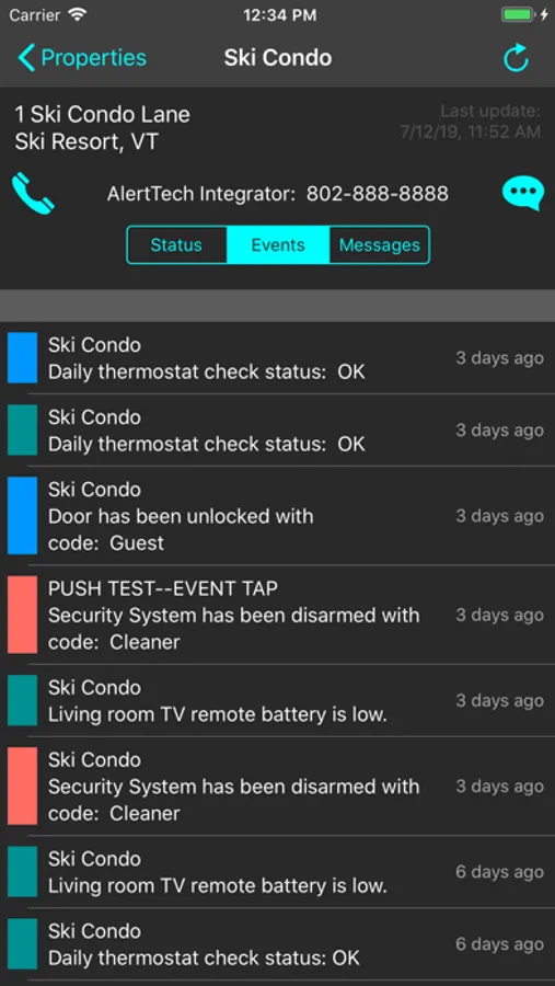 The push notifications sent to the end user's phone are organized and stored in a events history log for easy viewing of a current status and chronological history of the site.