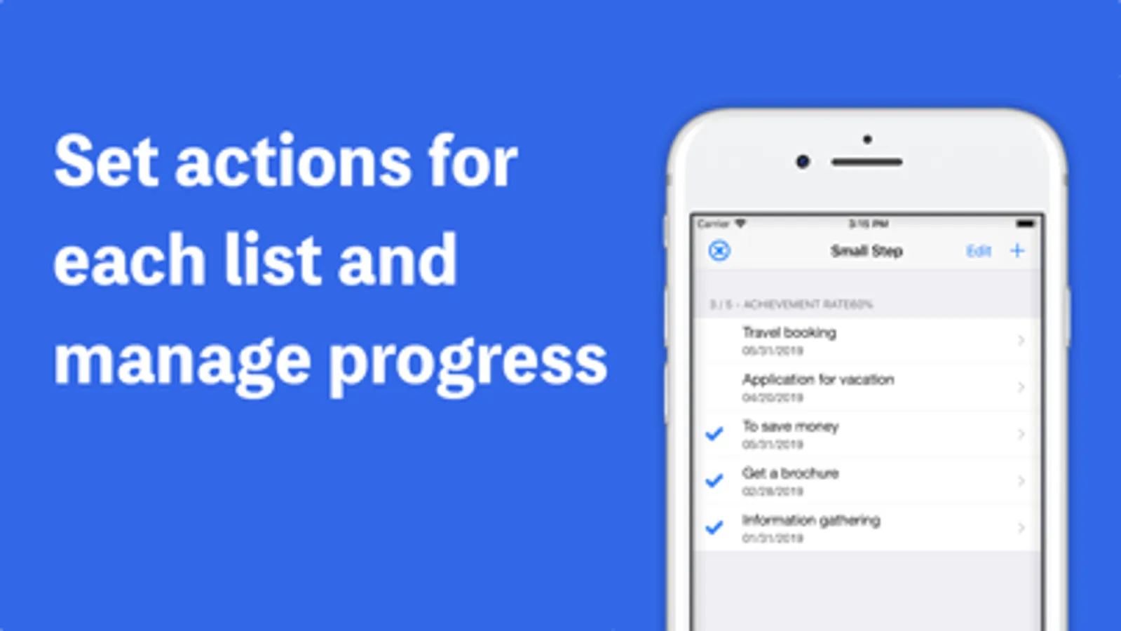Not only can you check what you want to do in the list, you can also set the image and manage the progress of small steps / intermediate goals.This app supports the realization of your dream you want with "Language" + "Visualization" + "Division of Action".