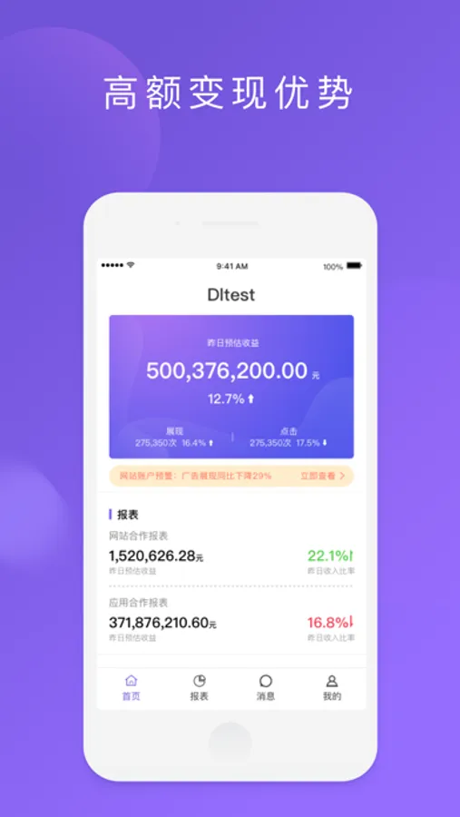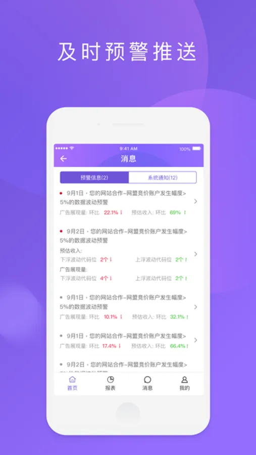 3. 便捷的消息查看及推送:支持方便快捷查看系统通知及预警消息,广告收益及预警波动第一时间进行推送,防止错过重要信息;