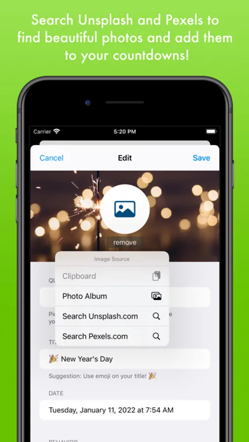 - Search Unsplash and Pexels for beautiful stock images to add to your countdowns.