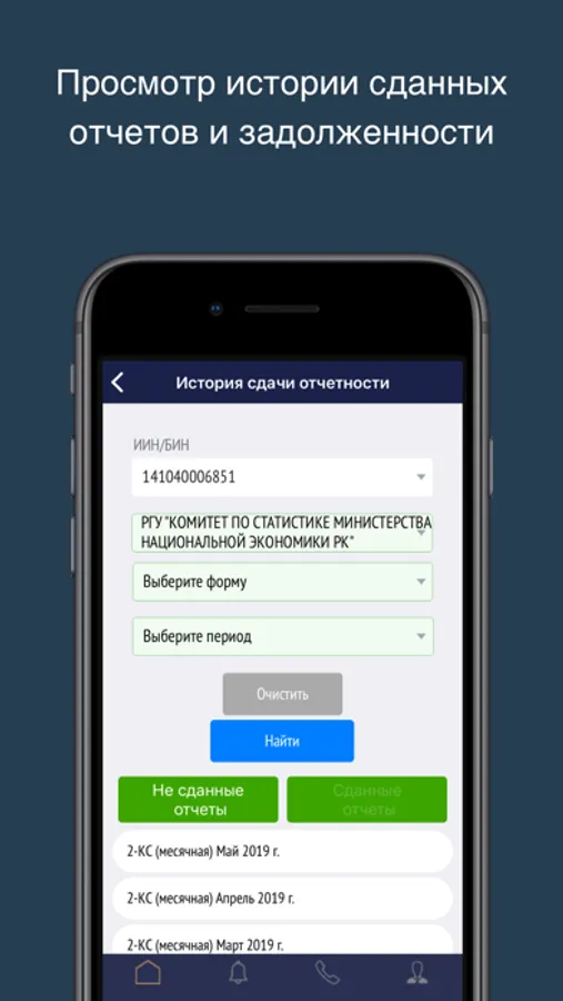 - Сданные - просмотр истории сданных отчетов с возможностью печати подтверждения о сдаче отчета;