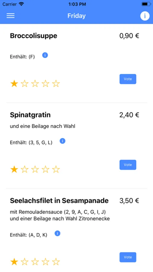 Mit einem Klick auf den Vote Button besteht die Möglichkeit, das Essen in der Mensa auf einer Skala von 1 bis 5 Sterne zu bewerten.