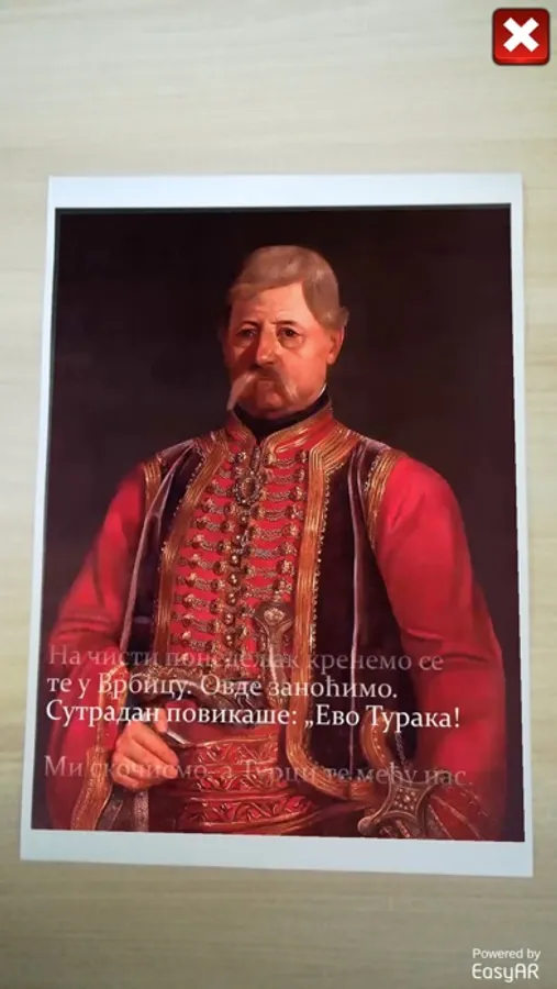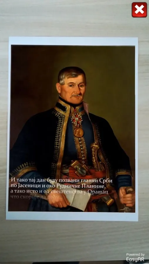 Application is developed for the Museum of Aranđelovac, Serbia. AR module recognizes picture of Serbian rebellion leaders and displays their speeches at the gathering in Orašac on February 1804. By directing camera of the mobile device towards images of Serbian rebellion leaders Karađorđe Petrović, the priest Atanasije bukovički, Janićije Đurić, and Petar Jokić, AR module displays their speeches. By recognizing the picture of Tanasko Rajić the user hears his biography.