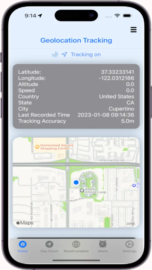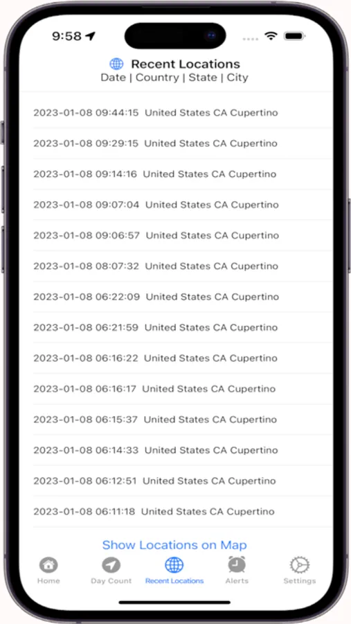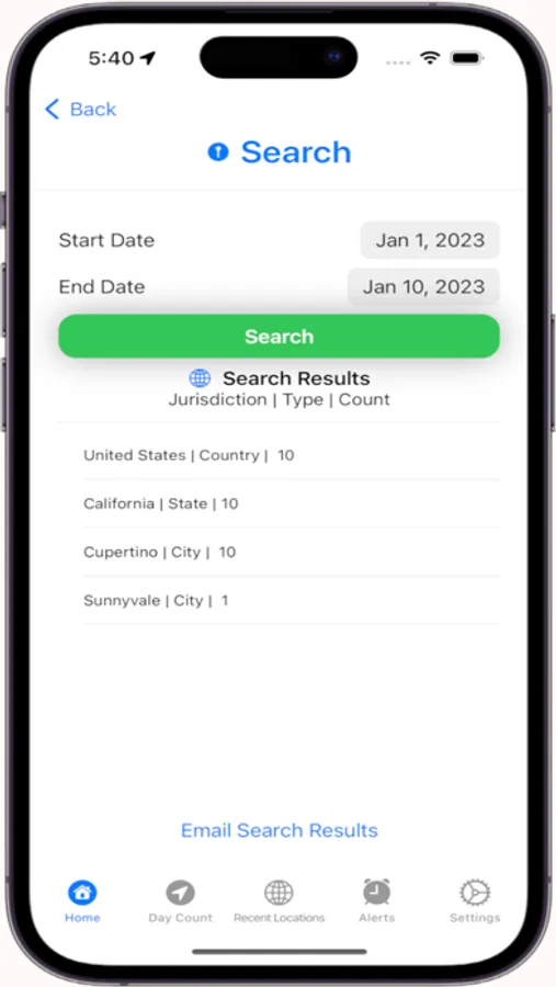 Search location day counts by dates. Email and/or download (in pdf or CSV/excel format) detailed logs containing all recorded locations showing your location throughout each day in the selected range or all days. Use for audit and other purposes.
