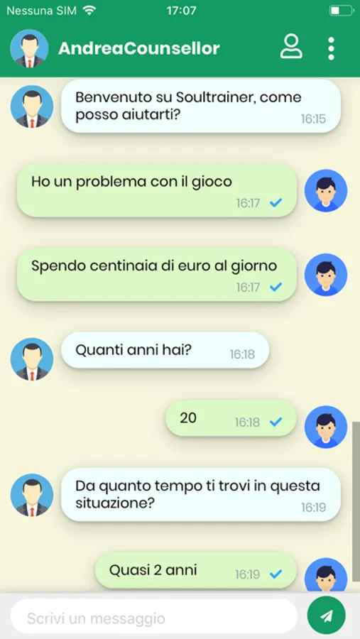 Soultrainer è una piattaforma di sostegno psicologico che consente, in totale anonimato, di accedere attraverso Smartphone, Computer o Tablet ad un colloquio via chat con un Professionista Psicologo, Dottore in tecniche Psicologiche o Medico Psicoterapeuta. Tutti gli esperti sono in possesso di specifica formazione in counselling online. Nel momento in cui un Utente si iscrive alla piattaforma e chiede di svolgere le live chat con un professionista registrato, la piattaforma cerca tra gli esperti disponibili e crea la associazione con l'utente.