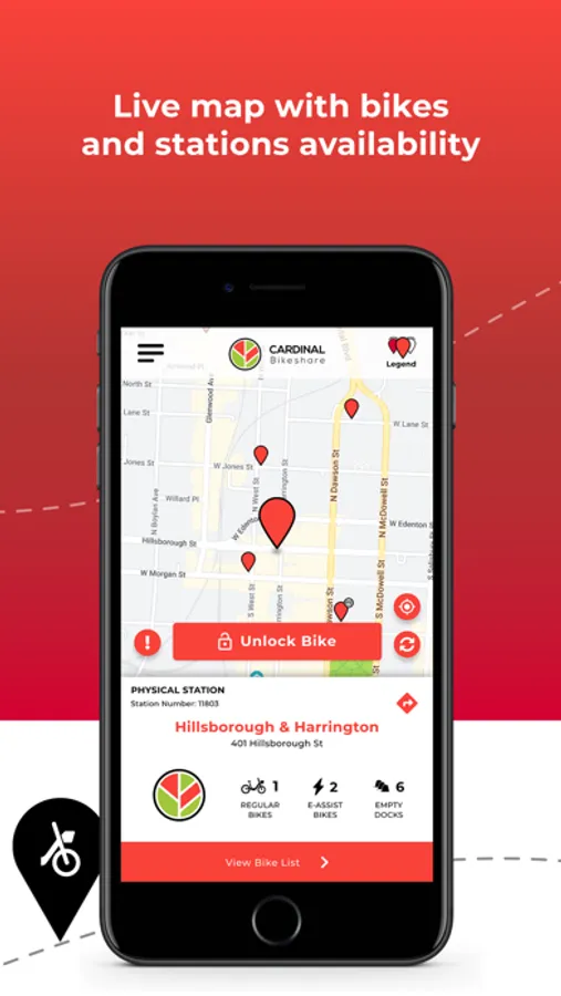 The official Cardinal Bikeshare App is your ultimate tool to bike around Raleigh. Use the App to check bike availability at each station as well as your profile and previous routes. You can even unlock a bike!