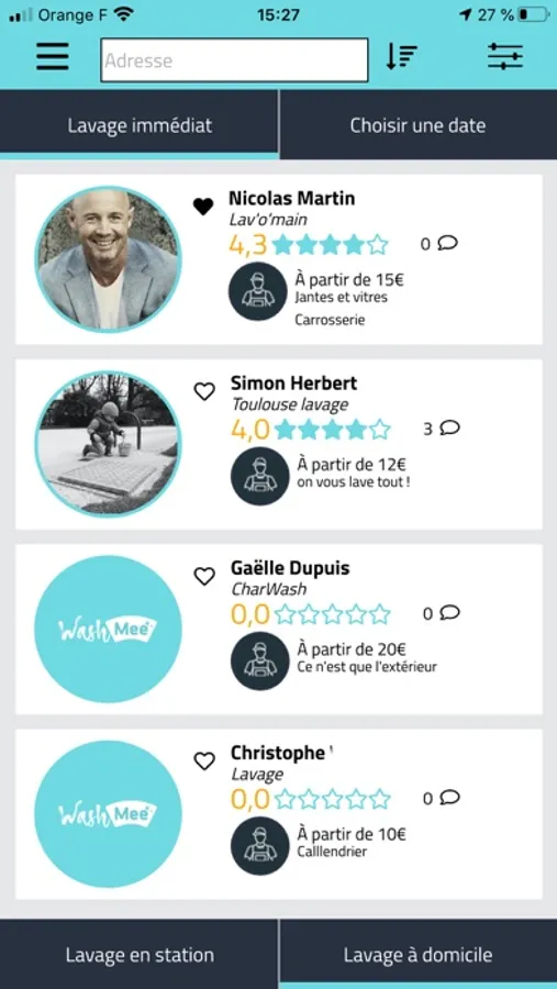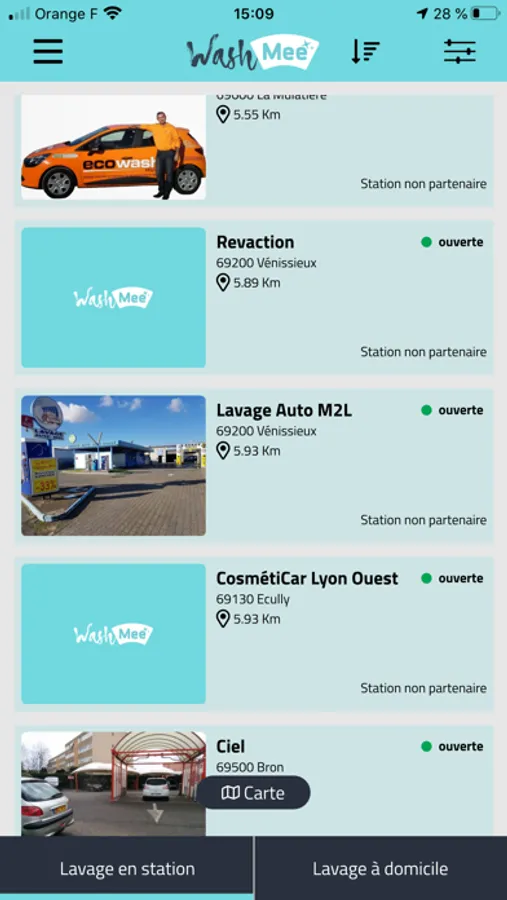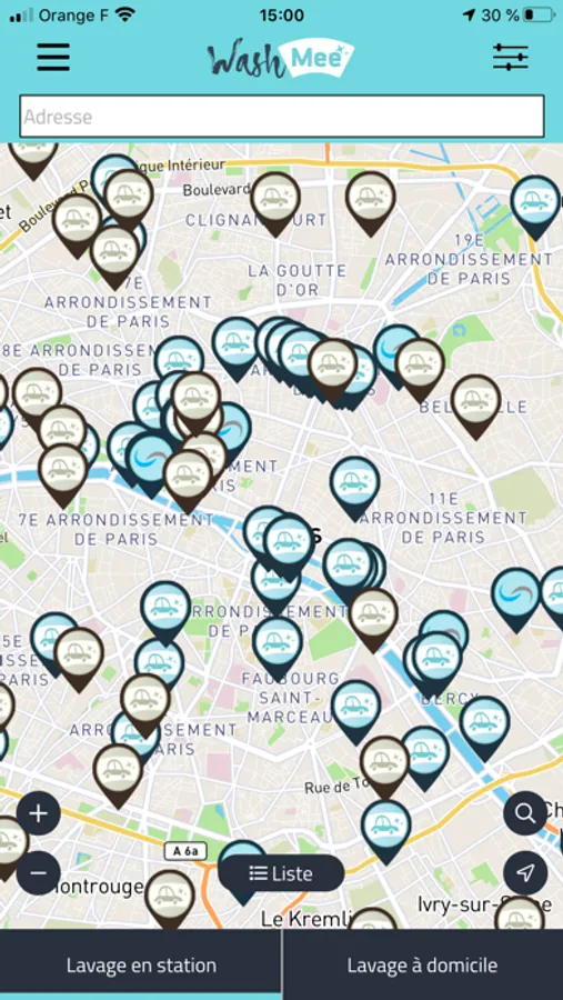 1- Grâce à la géolocalisation ou au moyen d'une adresse, WashMee affiche les résultats les plus pertinents pour vous.