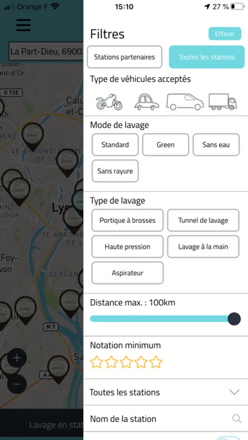 2- Trouvez le lavage de votre choix via nos filtres : type de véhicule, de lavage, selon la distance, par nom de la station, par note minimum…