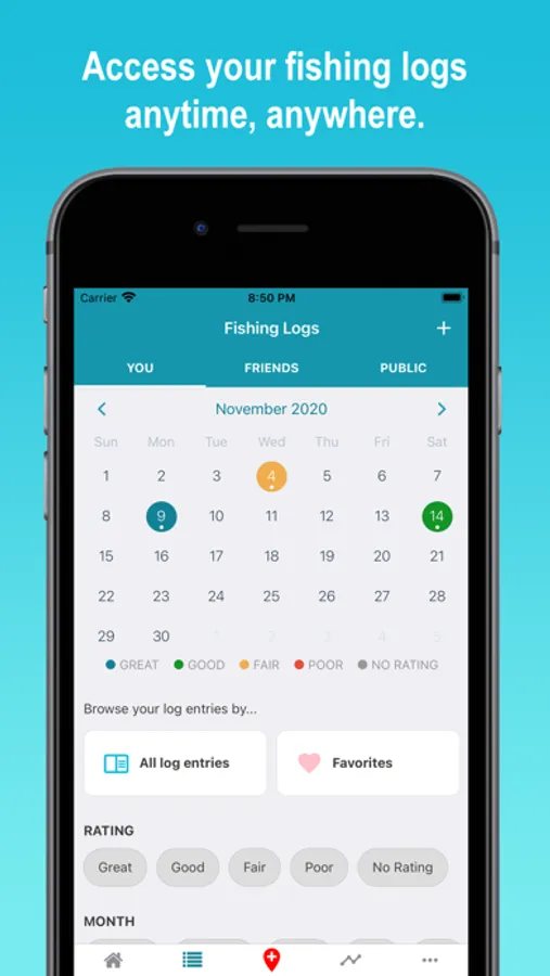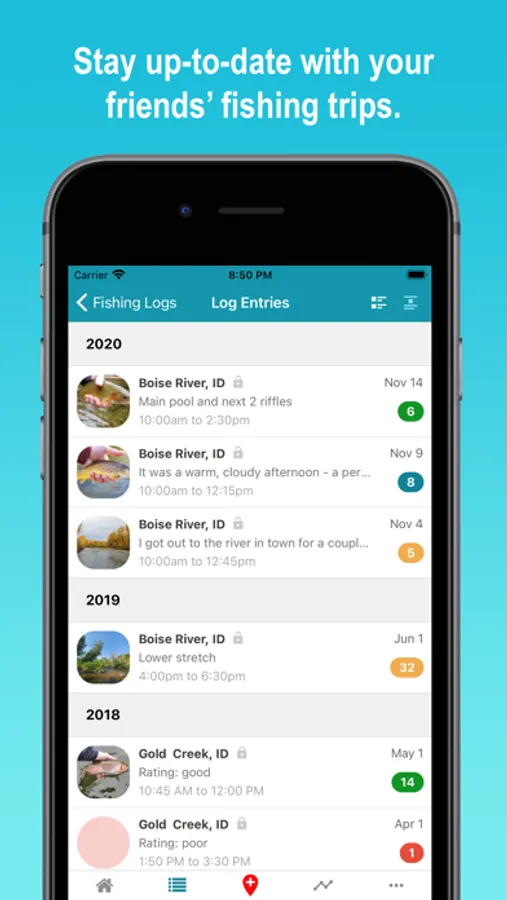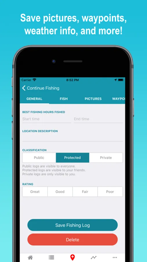 You can classify each fishing log you save as public, protected, or private. Public fishing logs are visible to anyone, protected fishing logs are visible to your friends, and private fishing logs are visible only to you.