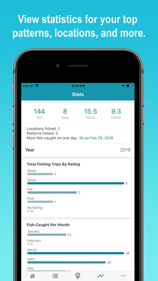 Fish catch statistics show you how many fish you caught, how many days you fished, which patterns caught the most fish, your top fishing locations, and more.