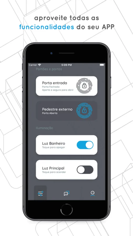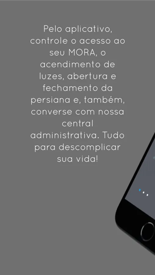 Pelo aplicativo, controle o acesso ao seu MORA, o acendimento de luzes, abertura e fechamento da persiana e, também, converse com nossa central administrativa. Tudo para descomplicar sua vida!