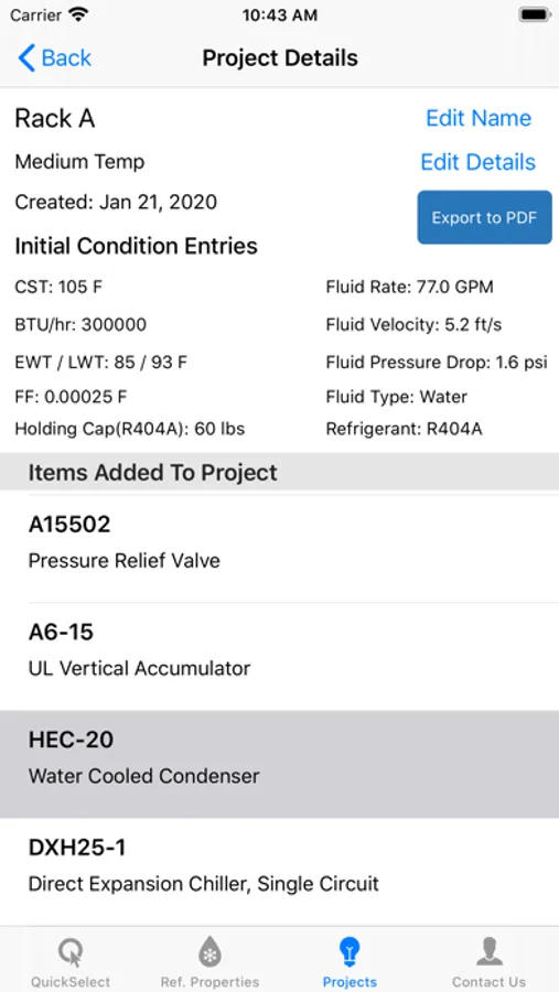 A Projects section allows for adding product selections to a group, where this Project can be exported via pdf, listing all the selections and initial conditions.