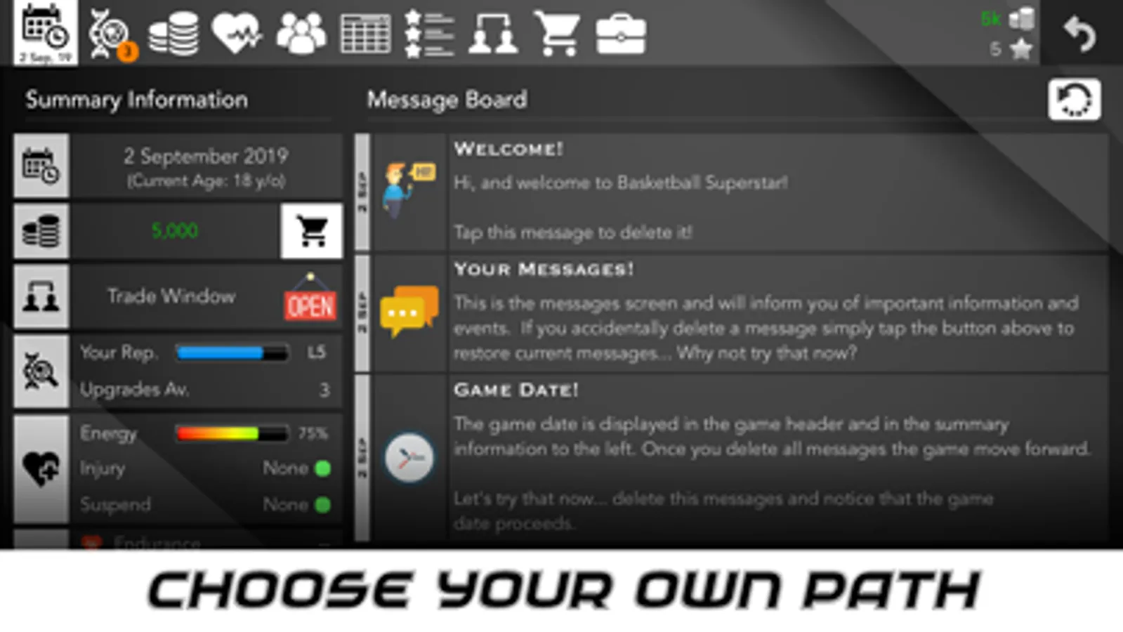 Basketball Superstar focuses on character development rather than quick reflexes. You start the game as at 18 year old free agent and play until you retire. What happens in-between is up to you!