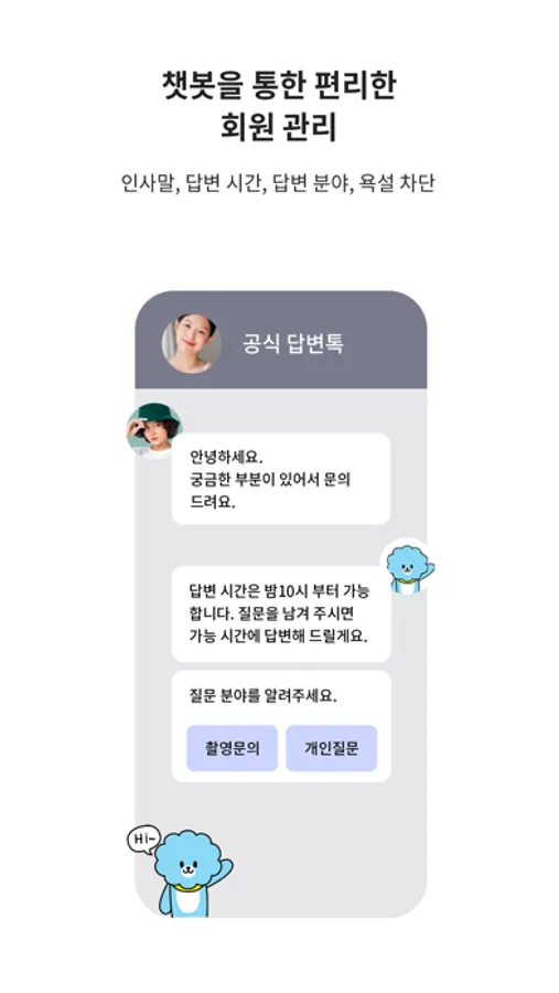 인사말, 답변 시간, 답변 분야, 욕설 차단 챗봇이 당신의 반복적인 업무 효율을 개선해 줍니다.