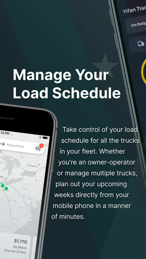 Take control of your load schedule for all trucks in your fleet—whether you're an owner-operator or manage multiple trucks—and plan out your upcoming weeks directly from your mobile phone in a manner of minutes. Keep your trucks loaded using a week-by-week calendar view to find gaps in your freight schedule and easily fill them with active load opportunities directly within the app.