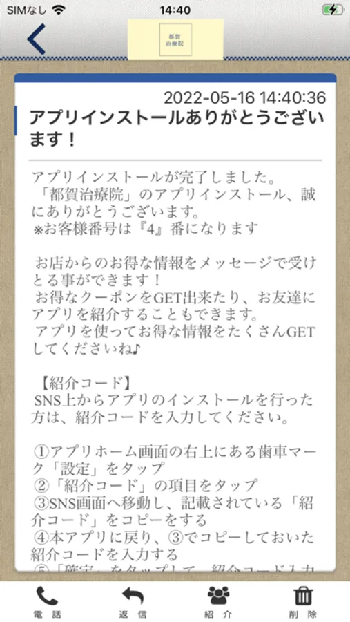 都賀治療院のアプリをSNSを通じてお友達に紹介する事ができます。