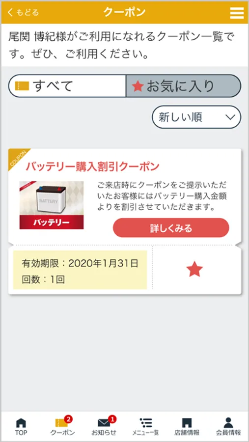 当社のアプリ「CAR LIFE SUPPORT」では、ご登録いただいた店舗で利用いただけるお得なクーポンや各種メニューの割引情報を配信しております。