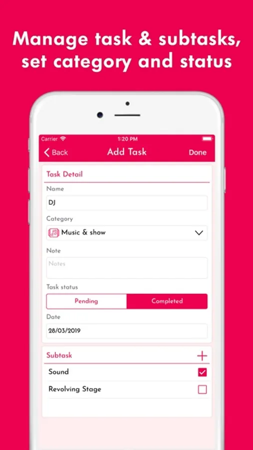 - Manage task & sub tasks, set category and status