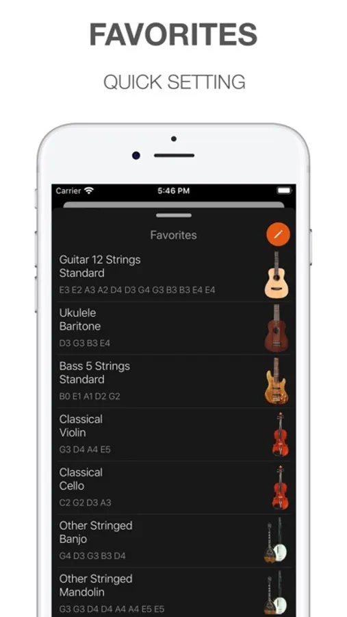 • Standard tuning for Guitar, Ukulele, Bass, Bass 5-string, Guitar 12-string, Ahenk, Chello