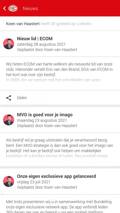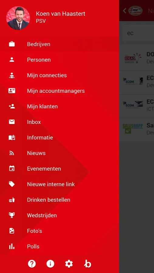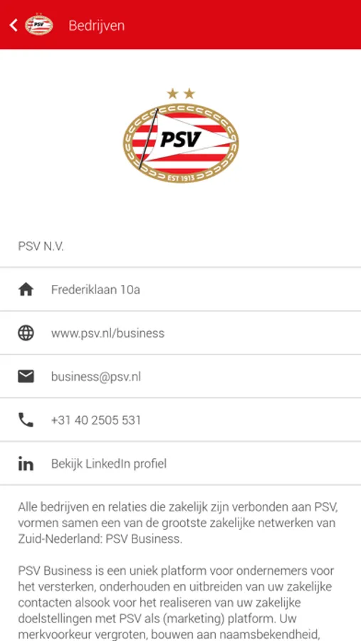 Verbreed uw zakelijke netwerk tijdens evenementen en wedstrijden van PSV! Met de Business app komt u eenvoudig in contact met andere leden van PSV Business. Bepaal zelf wanneer u open staat voor contacten én voor wie, of introduceer iemand aan een van uw connecties. Meld uzelf aan voor de diverse evenementen en wedstrijden van PSV, zodat u optimaal kunt genieten van uw PSV Business lidmaatschap. Graag vooraf eten in De Verlenging? Reserveer via de app eenvoudig uw restaurant.