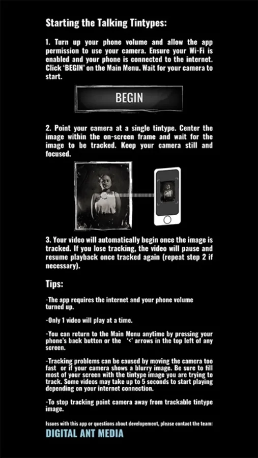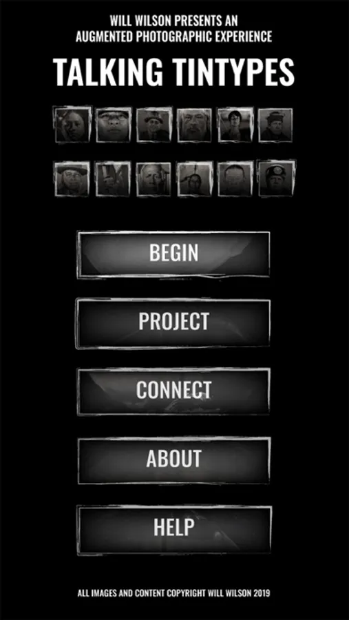 To activate the augmented reality (AR) content, you must be in a location where the Talking Tintypes collection is being exhibited (e.g. museum, gallery). You may also access limited content by visiting the artist's website: http://willwilson.photoshelter.com and selecting the "Talking Tintypes" collection.