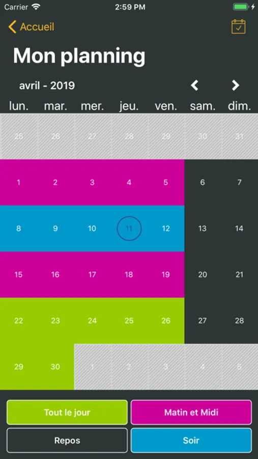 En 1 clic, faites votre emploi du temps ! Vous travaillez à la journée le 15 et que le matin du 18 ? C’est simple, vous remplissez votre planning à l’aide d’un code couleur distinct. D’un seul coup d’œil rapide, vous pouvez visualiser votre emploi du temps du mois.