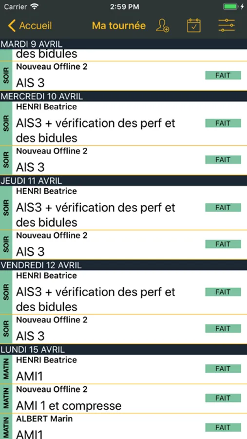 En 1 clic, visualiser votre tournée du jour ! La liste de vos patients ainsi que le soin à faire sont indiqués à la demi-journée ou à la journée en fonction de votre emploi du temps et de votre choix d’affichage. Vous pouvez suivre votre tournée du bout des doigts.