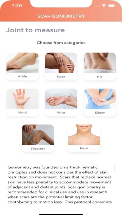 A goniometry guide for measuring range of motion or contracture when cutaneous scarring is present, such as with burn injury. This app is designed to help guide providers in the correct positioning of patients
