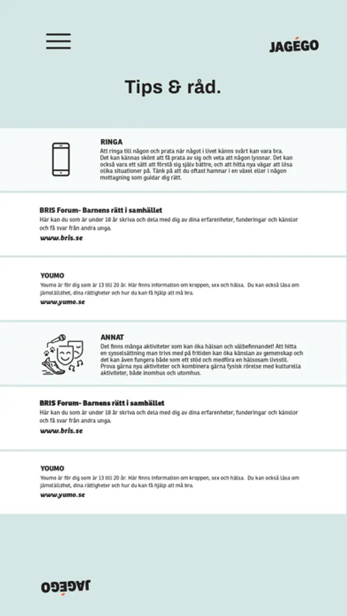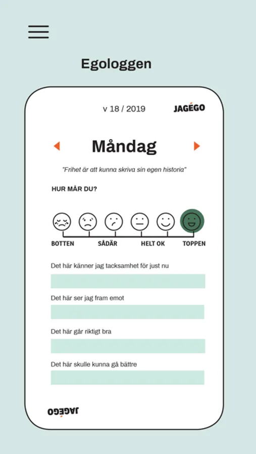 The app contains local contact information for youths concerning mental health. It also includes Egologgen, a diary in which you can reflect upon daily feelings and thoughts.