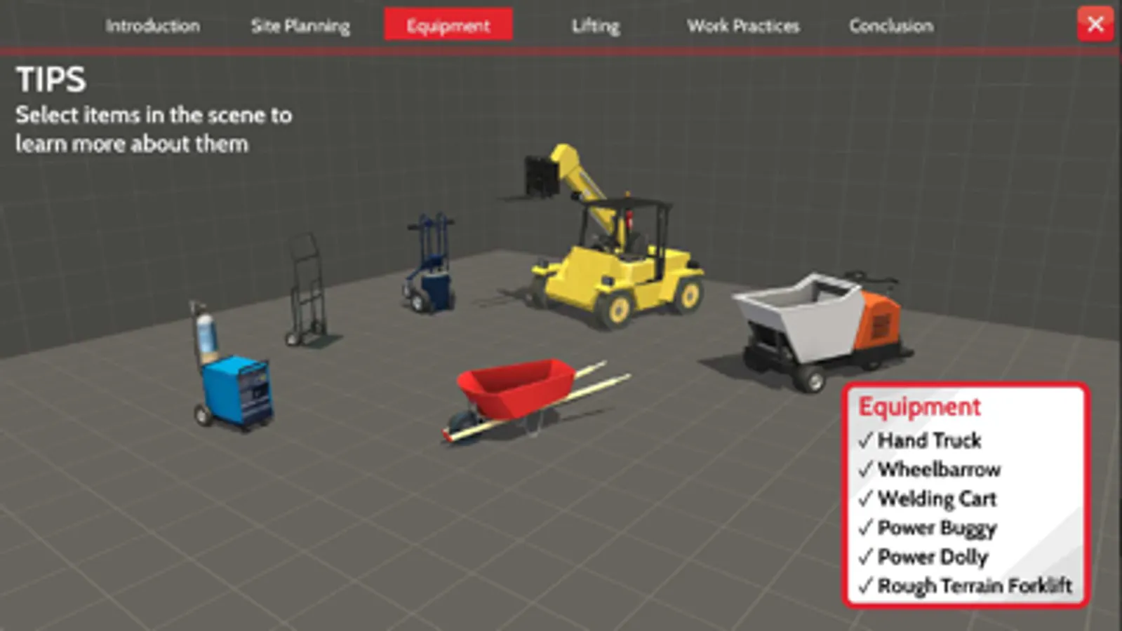 The Site Planning portion of the tool includes questions to consider and resources to help plan for safe materials handling throughout a project’s lifecycle – from preparing the bid through completing the project. It includes information on the benefits of engaging in safe practices, Excel spreadsheets, checklists, and on-site training materials to use during a construction project. The Interactive Training and Coaching sections can be used in a classroom setting or on their own to introduce the importance of planning to minimize manual materials handling, safe lifting practices, and the effects of poor lifting practices. The two Lift Coach games reinforce these practices and take the player through an interactive walkthrough of a worksite and the components that lead to safer manual materials handling.