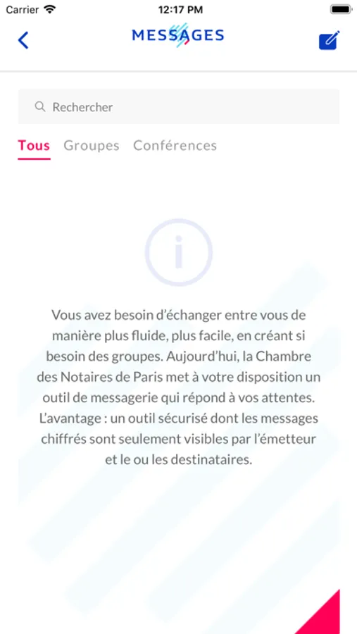 Cette application est un outil d’information et de communication pour les Notaires de la Compagnie de Paris. Les Notaires de Paris, du Val-de-Marne et de Seine-Saint-Denis ont ainsi accès en permanence et en mobilité aux informations utiles pour leur pratique professionnelle ainsi qu’à certains outils tels qu’une carte des prix de l’immobilier dans le Grand Paris ou des simulateurs de frais. Elle leur permet également de communiquer entre eux grâce à une messagerie privée et sécurisée.